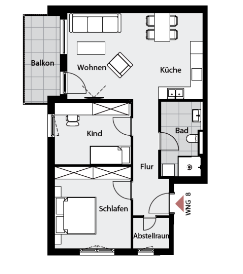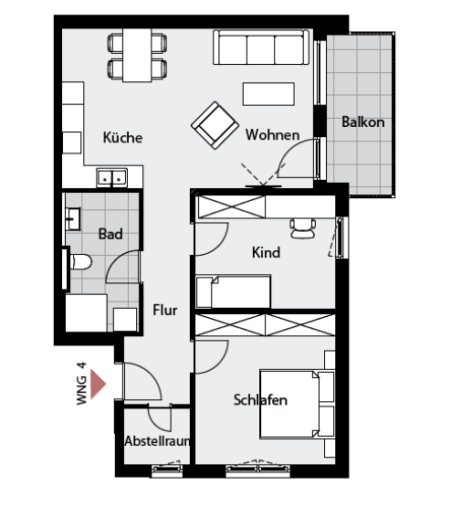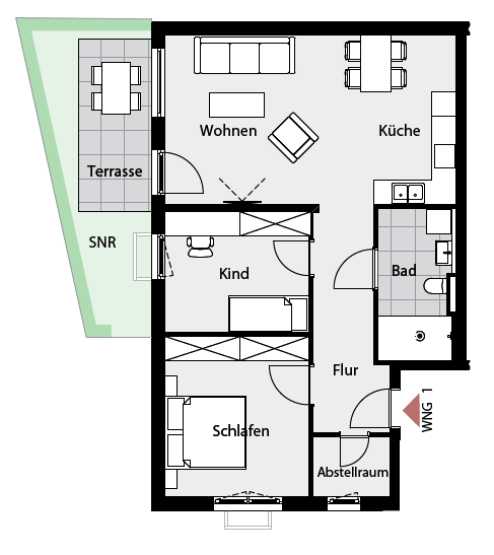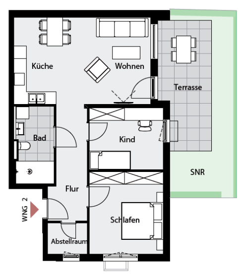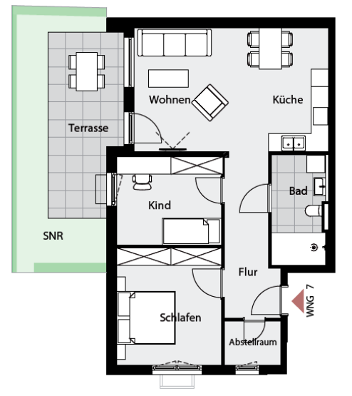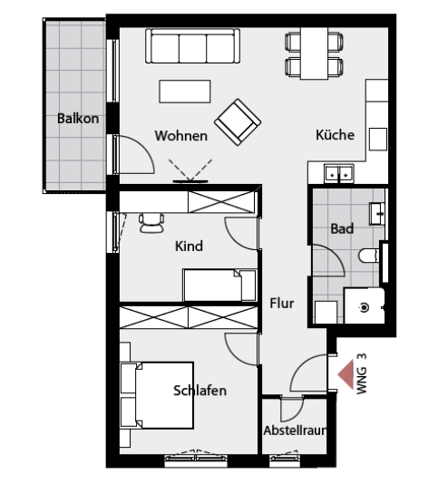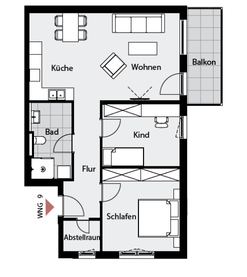 - Jede Wohnung erhält durch einen Balkon oder Terrasse einen zusätzlichen Ausgang in den Außenbereich