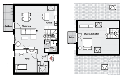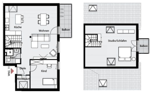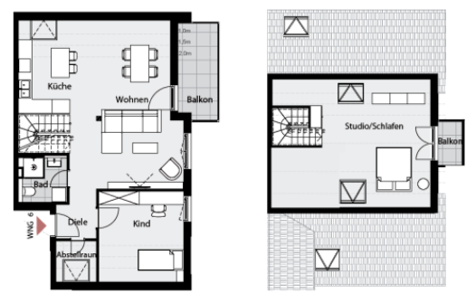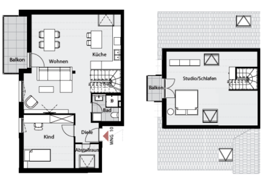 - Alle DG-Maisonette-Wohnungen erhalten auf jeder Wohnebene einen Balkon