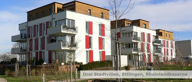 Beschreibung Mit der Fertigstellung der letzten Stadtvilla im Jahre 2006 konnten wir im Zeitraum zwischen 2002 und 2006 insgesamt 7 Reihenhäuser, 6 Doppelhaushälften, 3 Stadtvillen (27 Wohnungen) und 2 Tiefgaragen auf dem Areal der ehemaligen Rheinlandkaserne in Ettlingen errichten.